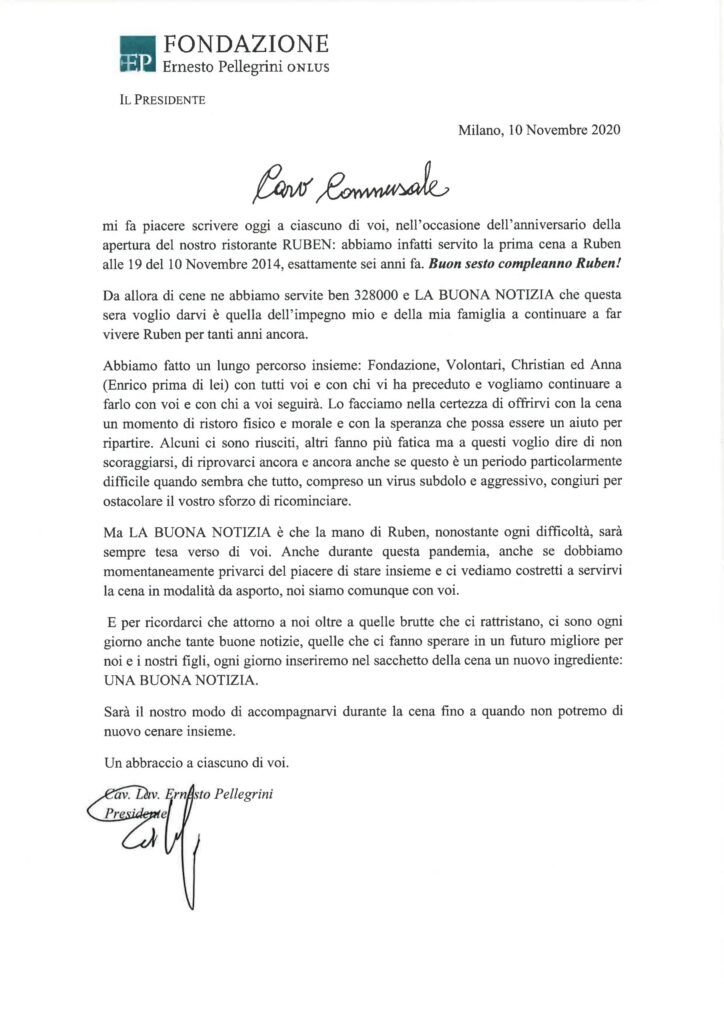 Ruben invece un prospettiva vuole averla e deve averla per poterla dare, e per questo abbiamo deciso di aggiungere tra gli ingredienti della cena da asporto una buona notizia: da lunedi 10 novembre nella confezione della cena, oltre alle pietanze, i commensali troveranno tutte le sere una notizia “edificante” stampata, una piccola pergamena che simbolicamente vuole riconnettere storie di difficoltà e indigenza con una prospettiva positiva. La prima notizia è stata un messaggio del Presidente Pellegrini che ha ricordato l’anniversario di una buona notizia, il sesto anniversario dell’apertura di Ristorante Solidale Ruben e la rassicurazione che ci siamo e ci saremo, per accompagnare questa difficile transizione, perchè la cura delle relazioni è il primo passo per costruire insieme nuove prospettive.