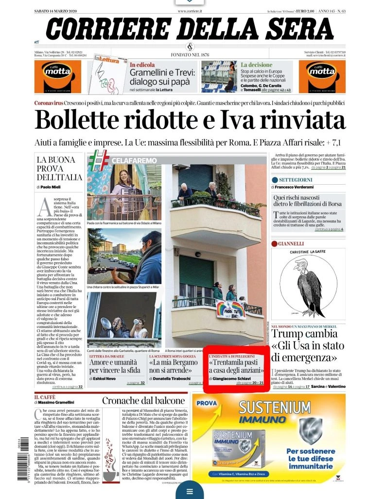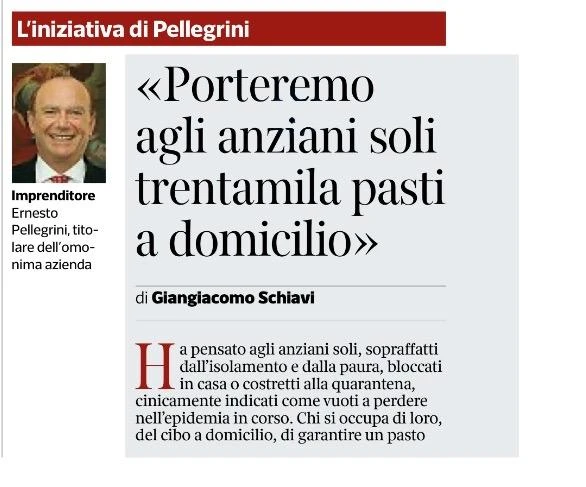 In queste delicate giornate di emergenza sanitaria per il nostro Paese, la #Pellegrini ha deciso di compiere un gesto di #solidarietà. Produrremo e consegneremo a titolo gratuito 30.000 pasti al domicilio di #anziani e persone in #quarantena (o isolamento volontario) in 17 Comuni italiani, nei quali siamo presenti con un Centro di Cottura. I pasti saranno preparati e distribuiti dal 16 marzo fino al 15 giugno. Il nostro #Presidente Ernesto Pellegrini ha dichiarato: “Ritengo doveroso per un imprenditore essere d’aiuto alla comunità nei momenti più difficili: sono figlio di contadini, ho conosciuto le difficoltà della guerra, ma anche il valore della solidarietà. Oggi sono quindi contento di offrire un ristoro alle persone in difficoltà, restituendo un poco del tanto che ho avuto dalla vita.” Qui sotto l’articolo che Giangiacomo Schiavi ha dedicato oggi sul Corriere della Sera alla nostra iniziativa, con un richiamo in prima pagina.
